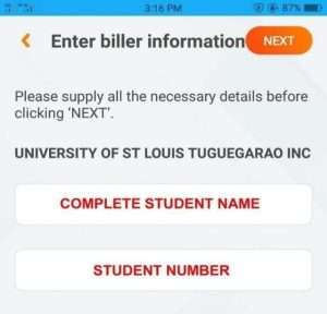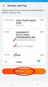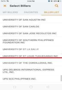 - Select UNIVERSITY OF SAINT LOUIS TUGUEGARAO from the list of merchants then click Continue